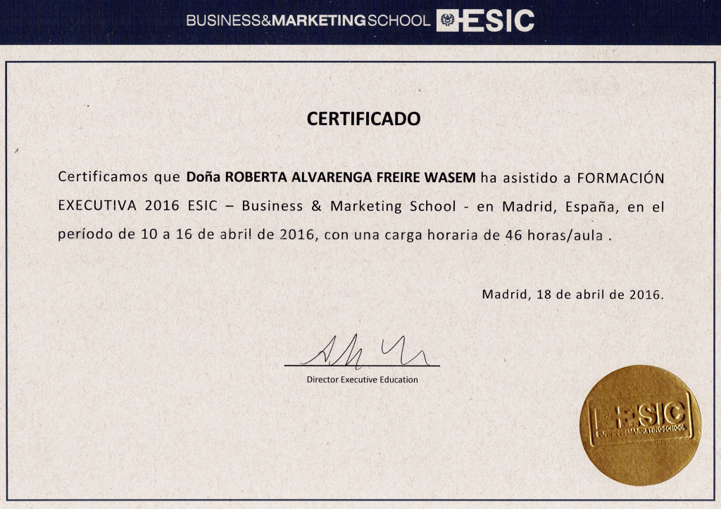 Ao final do módulo, os participantes receberão um Certificado Internacional ESIC, que comprova a participação e conclusão do programa com até 46 horas/aula, atestando o aprendizado em uma das principais Business Schools da Europa. Esse certificado é amplamente reconhecido no mercado e confere prestígio ao seu currículo, sendo um diferencial competitivo para sua carreira.